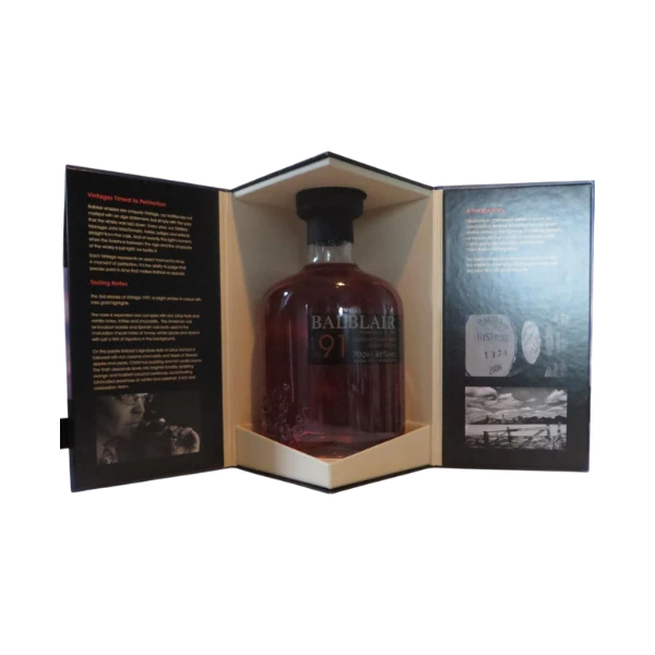 Una rarità, il Single Malt Balblair 1991, invecchiato per 27 anni in botti di rovere americano ex Bourbon e successivamente affinato in botti ex Sherry, si distingue per la sua straordinaria eleganza. Presenta uno spirito purissimo e un colore dorato antico, decadente e sensuale, che offre un piacere unico per i palati più esigenti.